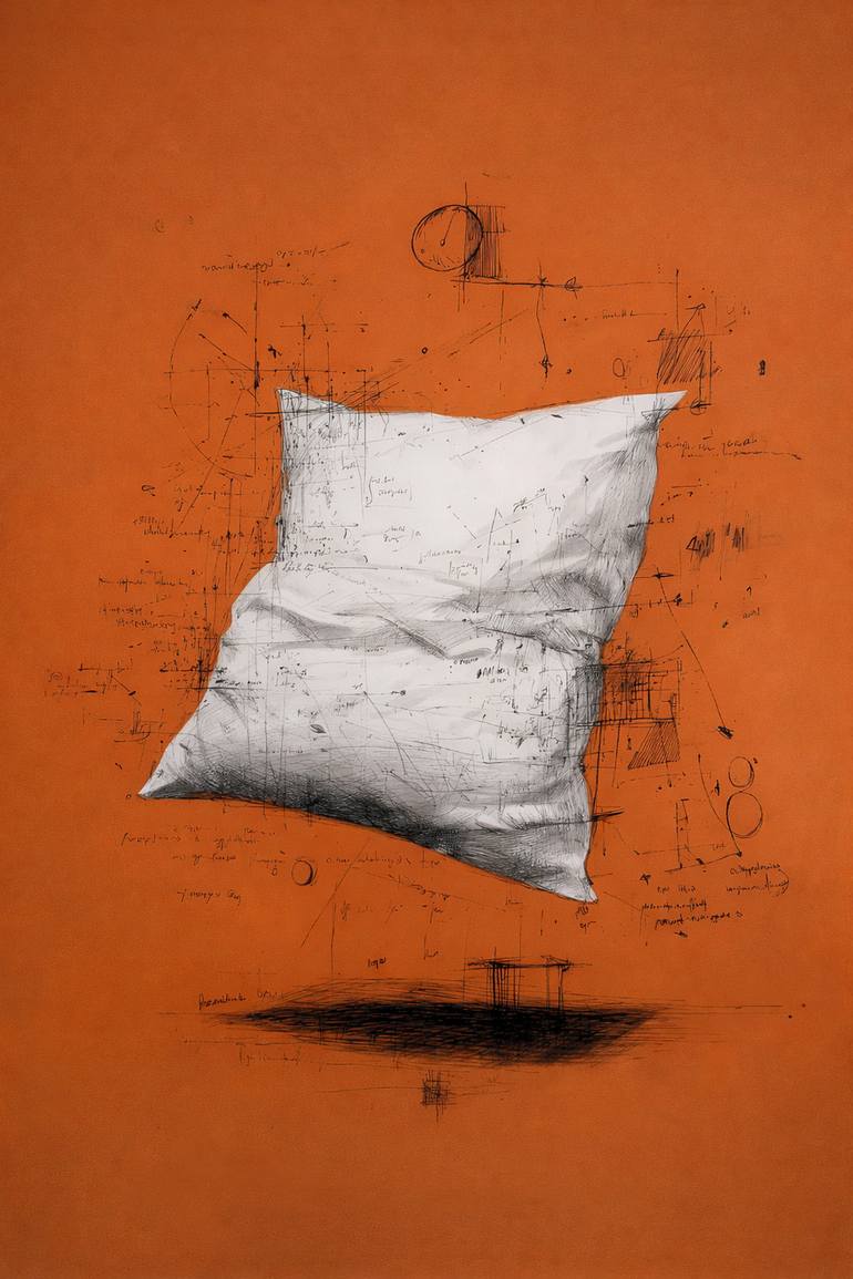 Equation of Rest is a symbolic and surreal digital artwork, a giclée print on canvas that captures the invisible mathematics of rest. In this abstract composition, a white pillow floats serenely amidst a field of formulas and architectural sketches, suspended between the realms of logic and emotion....