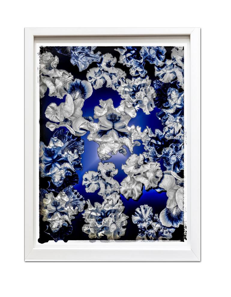 Macro photos of Irises, all colorized in a shade of blue. Named after the Greek goddess of the rainbow, Irises bring color to the garden in spring and summer. These versions have been digitally manipulated, multiplied and colorized, providing a luminous glass-like look. Version 6 has an "eroded" bor...
