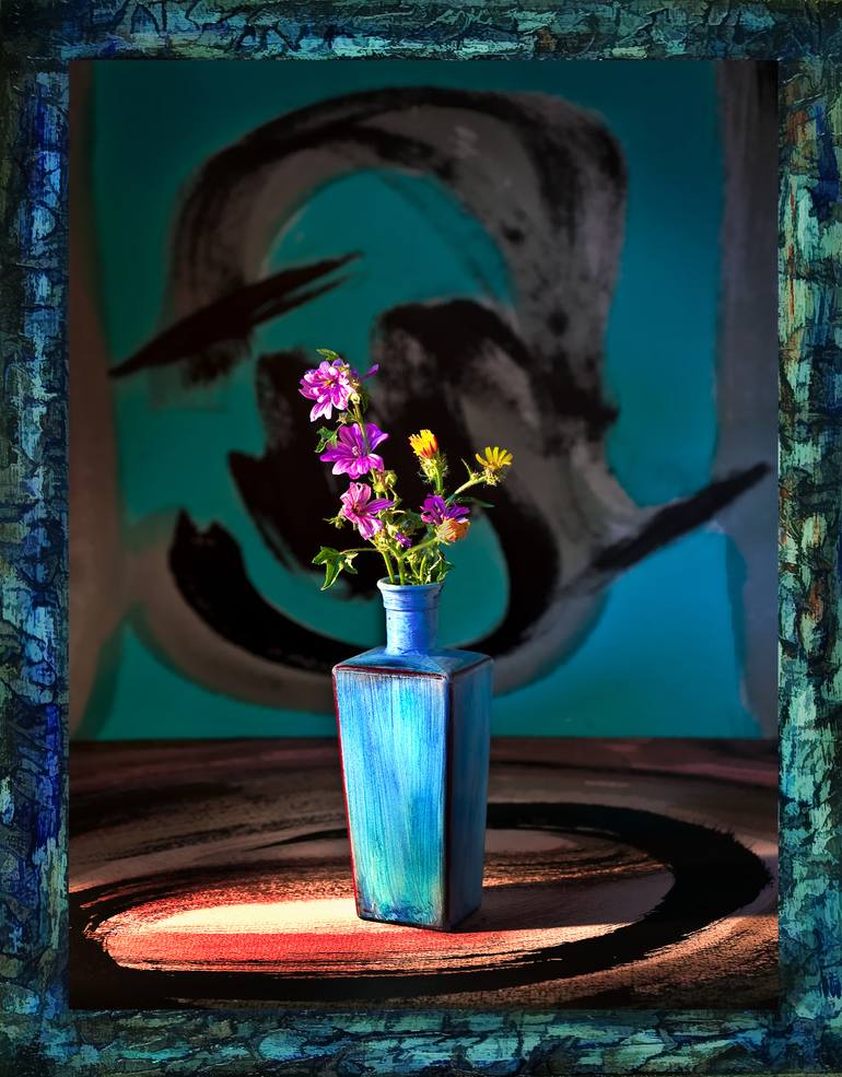 This floral still life is part of a series that I used my watercolor brush paintings in the background and surface. The idea was to create a connection between the two. I also painted the small flower vase and picked the flowers from my yard.