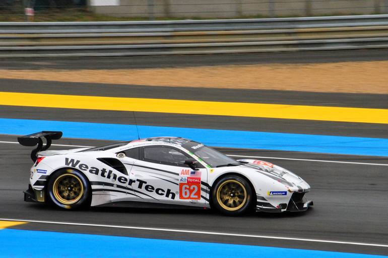 Experience the thrill of the race with this fine art photograph, "Ferrari 488 GTE 24 Hours Of Le Mans 2019." Captured during the legendary 24 Hours of Le Mans endurance race in France, this contemporary piece features the Weathertech Racing Ferrari 488 GTE no62 in full color. Photography by Andy Eva...