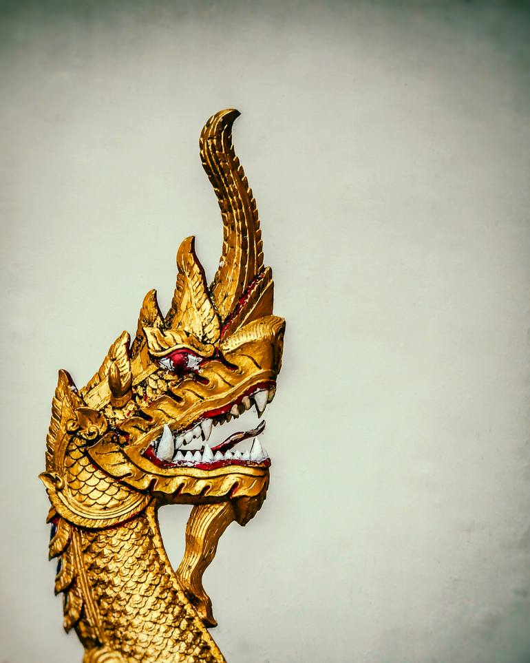 A fierce golden dragon bearing teeth, an ornate decorative statue at Wat Phra That Doi Suthep Temple, Chiang Mai, Thailand.