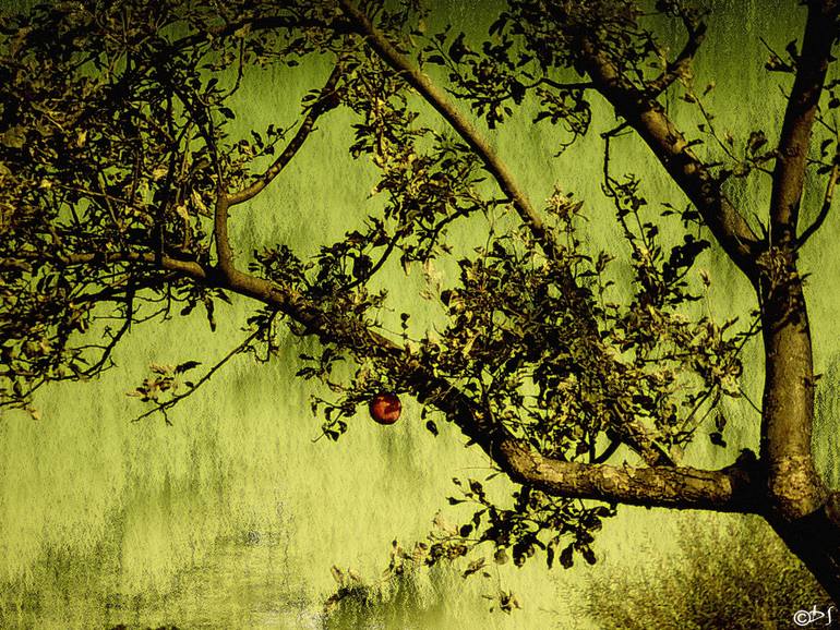 One summer day in a garden I saw a only one apple in a tree. I take this picture. Color photography (20x15)inch, printed on Fine Art Paper and Photo Paper, delivery by Saatchi Art.