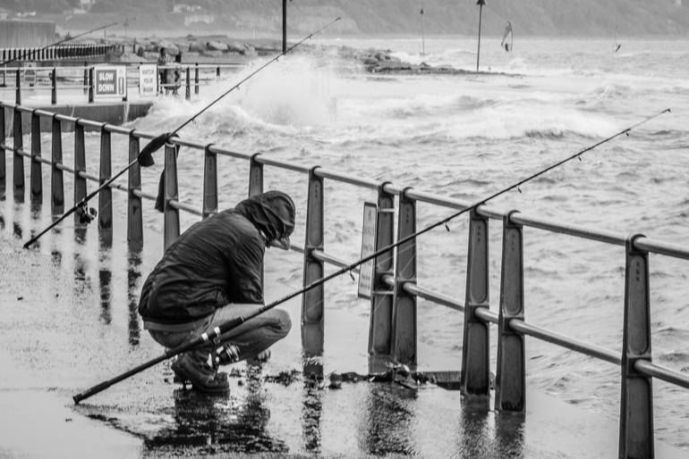 A solitary windswept fisherman battles with the elements. Taken during a storm at Muddeford Quay, Dorset.