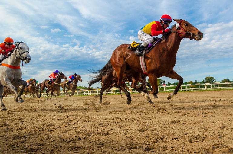 A thrilling moment captured on the racetrack as powerful racehorses surge forward, their jockeys urging them with precision and determination. The energy, speed, and intensity of the competition are frozen in time, showcasing the raw spirit of horse racing against a vivid sky. This photograph was in...