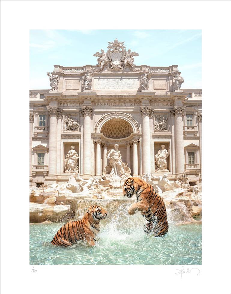 A playful scene of two tigers splashing in the most iconic fountain of Rome. This giclée print is from a limited edition of 80, the artwork comes hand-signed and numbered. Printed on Hahnemühle Photo Rag Satin.