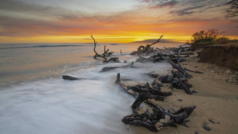 After a recent swell and storm a lot of dead trees showed up on the beach. The waves were coming in and I was inspired to slow the shutter down and create the swirls of water around the trees. Just after the sun set behind the island of Lanai, the colors popped and everything came together to creat...