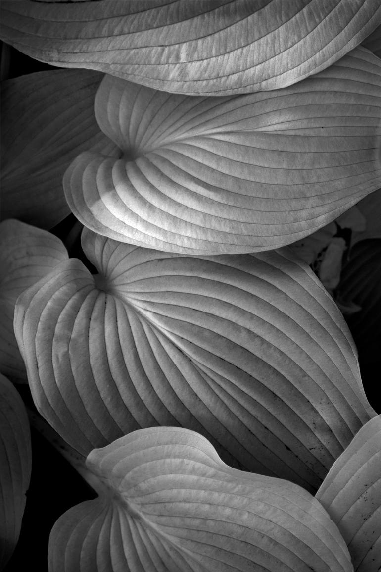 An image of four leaves of the common landscape plant, the hosta, taken in a garden with an infrared enabled digital camera. Infrared records leaves, plants, and living thing lighter than normal. Infrared is a type of light beyond the range of the human eye to see. By using a very dark filter that...