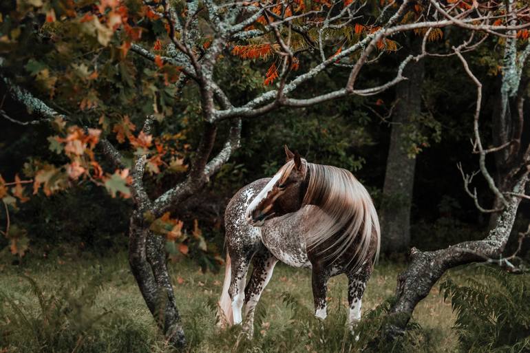 The piece captures Bambi, a gracious horse, in a static posture. The invisible wind and the horse's hairstyle contribute to painterly aesthetics, making the image feel like a Surrealist setting. The artwork's horizontal composition is almost perfectly symmetric. Standing between trees, Bambi looks ...