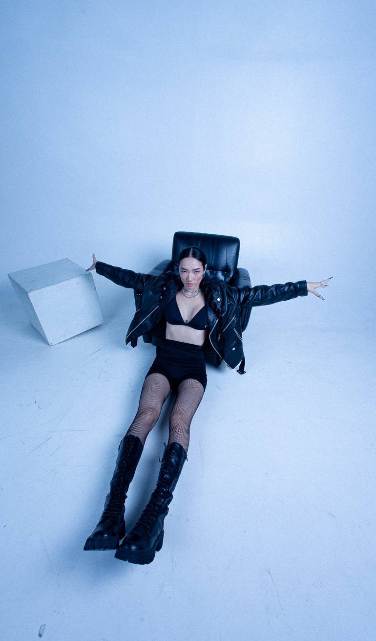 The photo is inspired by the attitudes of the past, collaborating the models expression, and body language through muted colours and a cool blue film aesthetic, the models pose shows a sense like of rebellion and charm. The large open canvas allows the viewer to be in the room with the model, the ...