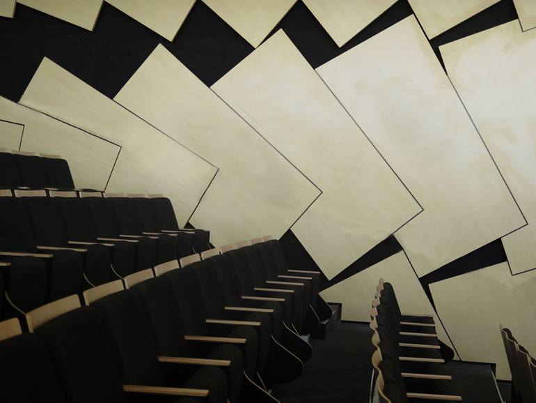 The geometry of the panels in this auditorium look so random and chaotic at first glance but eventually form order. The convergence of triangles and rectangles seemingly divergent form a cleverly coordinated whole.