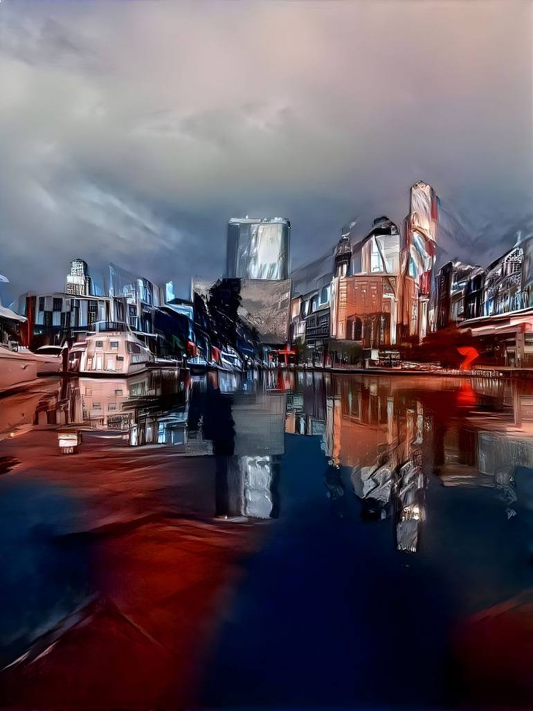 The 'Docklands at Dusk' series is based on photographs taken of Docklands in Melbourne and the Harbour waterfront as seen from a boat around dusk. The weather conditions made for a dark stormy sky which provided a theatrical backdrop for the vivid colors of the sunset projecting it light cinematical...