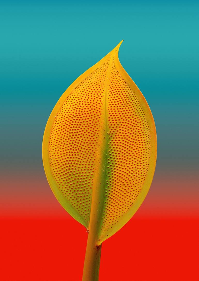 This work is from limited medium-size series of colorful expressionistic fine art flowers! Gambodge leaf on crimson-blue. Poetically calling "Streamline". Color modern expressionism in still life fine art photography. The whole philosophy of my art is described in the author's biography, please rea...