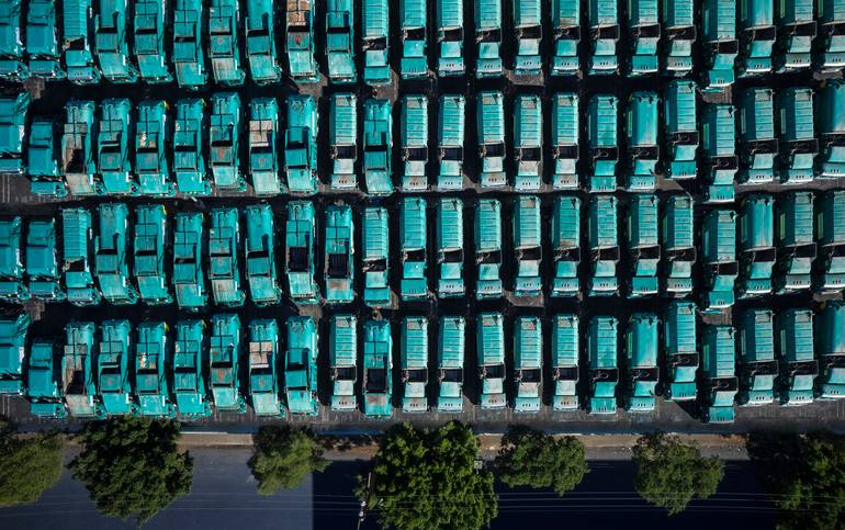 Aerial shot of the garbage truck yard in Los Angels Downtown.