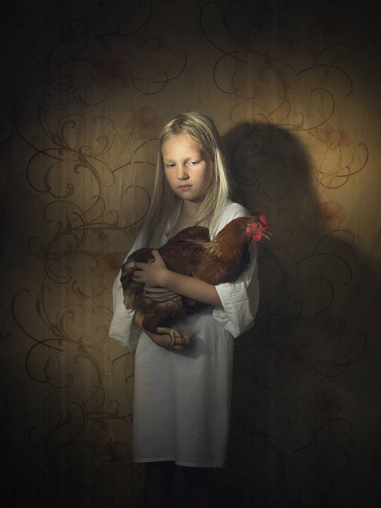 A solemn girl stands by a faded floral wall, holding a hen close to her chest. Her gaze carries a quiet sadness, while the gentle embrace reflects a unique connection between the child and her only companion. This photo is to be hung somewhere you see every day. Whether that be in your bedroom and i...