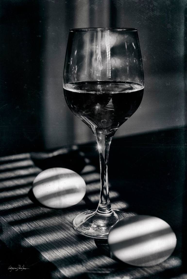 This black and white digital photograph, "Glass of Wine", is a modern still life that brings a touch of minimalist elegance to any space. The monochromatic palette and conceptual style evoke a sense of timelessness, reminiscent of old analog photography. The composition features a glass of wine alo...