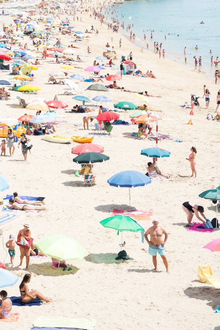 People sunbathe under the bright summer sunshine, enjoying a relaxing day at the beach. The photograph's colours range from white to pastel tones, creating a soft and calm atmosphere. From a Limited Edition of 25 - Signed Certificate of Authenticity with Edition Number. - Printed on Hahnemühle Fine...
