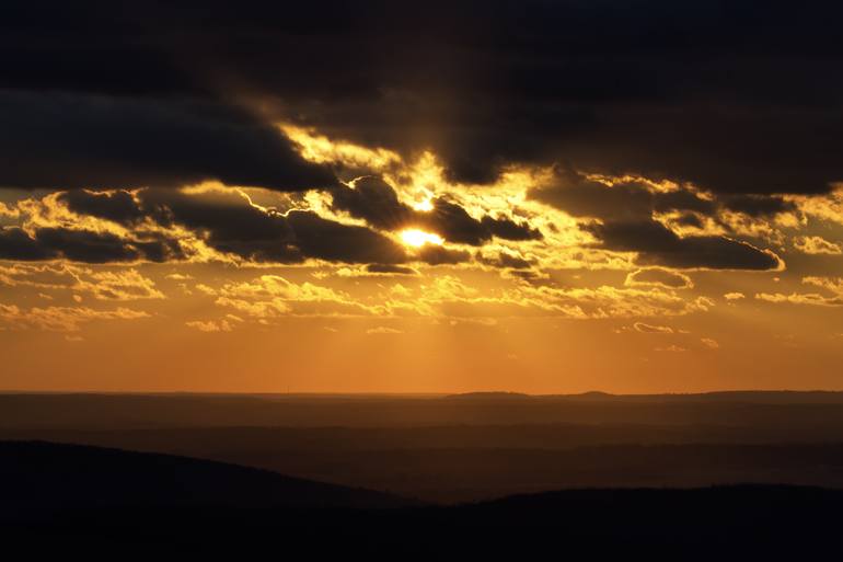 Golden sunlight pierces through dark clouds, casting a warm glow across the hills. The contrast between light and shadow creates a dramatic effect.