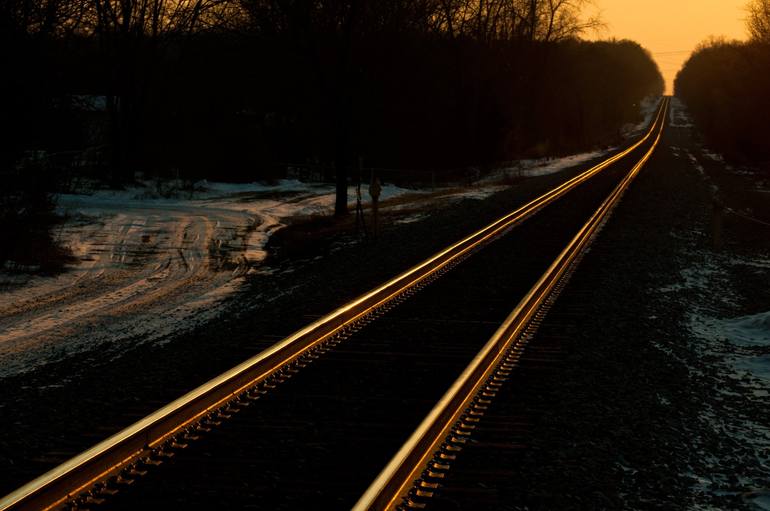 The setting sun glints off the rails of the Norfolk Southern Railway at Nokesville, Virginia