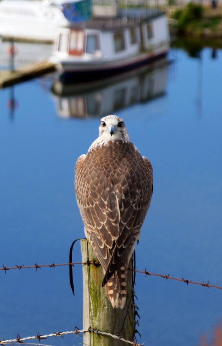 Naughty Goshawk flew away from its owner, and came to rest on a post in Uphill today, and I was lucky enough to get close. But it heard me and looked round!!!