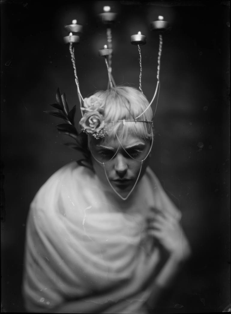 Working from a sketch, and using a handmade crown of wire and candles, the intent of this series of images was to create an air of mystery. An evocative otherness. Here but not here.