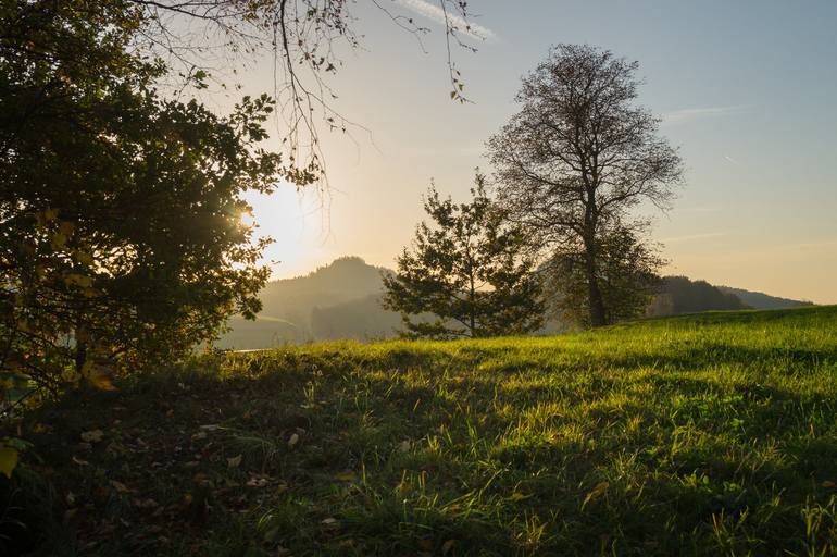 Late summer sunset and view towards the Bärensteine mountains in Saxon Switzerland. A green meadow and trees in the evening light. Golden sunbeams kiss the green grass. Soon the sun will set behind the mountains. It is a warm and calm atmosphere at the end of summer - and a hint of autumn is already...