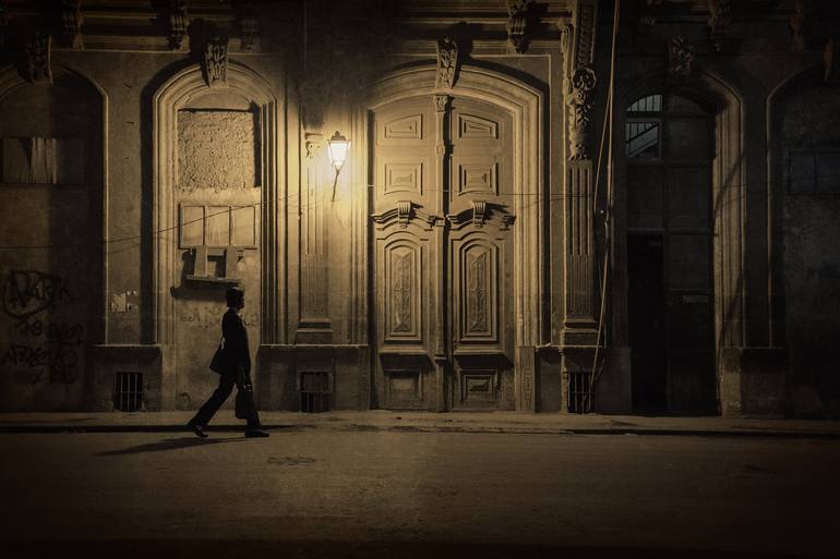 A lone figure walks in the quite hours through the city of Havana, Cuba, illuminated by a solitary street lamp. A monochromatic treatment was preferred to make the subject stand out against the architecture.