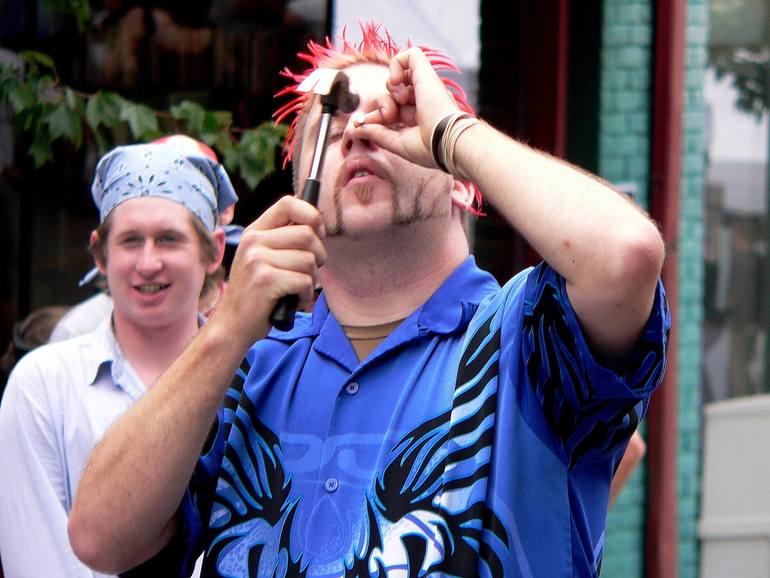 I was photographing a street fair in Asheville, North Carolina and my eye was attracted to this new age hippie hammering a nail into his head. I'm sure it must have been some kind of trick as he seemed to enjoy himself. The limited edition pritns are on Canson Infinity paper.. It's signed and number...