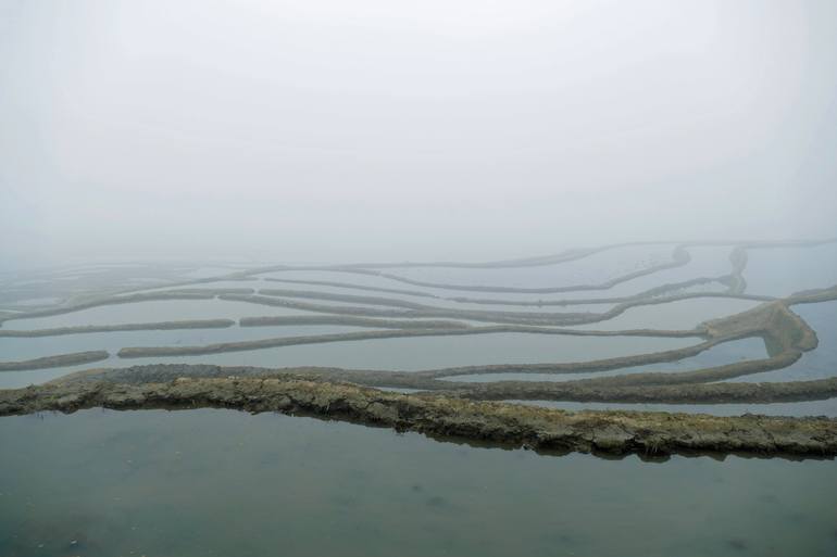 These rice paddies seem to float in fog, look like 'Hanging gardens' though these flooded fields don't show any rice sprouts in spring yet. The photograph was taken at a World Heritage Site in China, during a longer, fascinating hike through the fog. The site is well known for its amazing rice-padd...