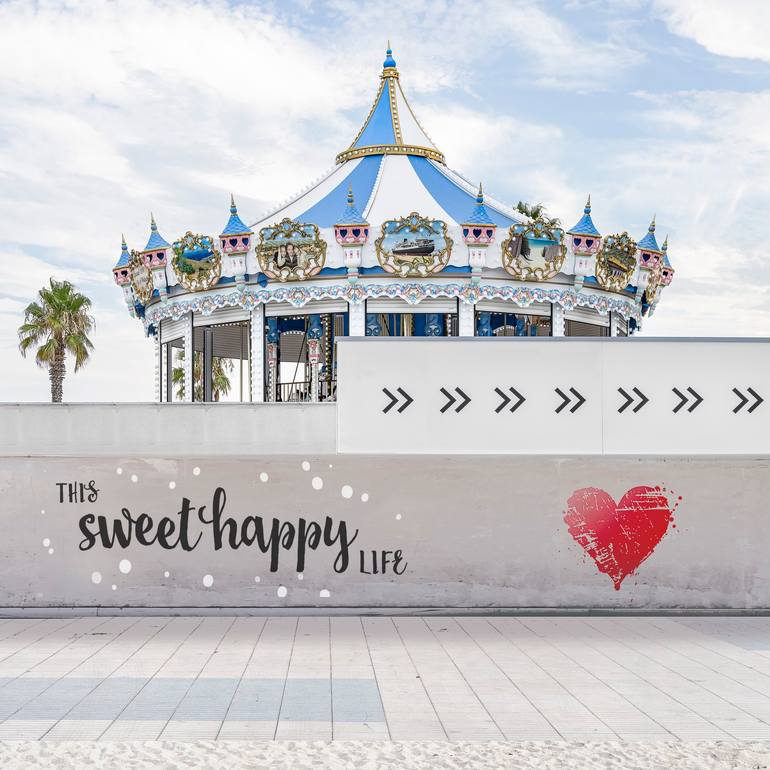 “Happy Life” 2023 Assembly of several photographs taken in a famous seaside resort in the south of France in the Mediterranean - Le barcares Limited edition of 10 copies in this format. 50 cm x 50 cm with a 3 cm white border around the work, making a total of 56 x 56 cm Print on Fujicolor Crysta...