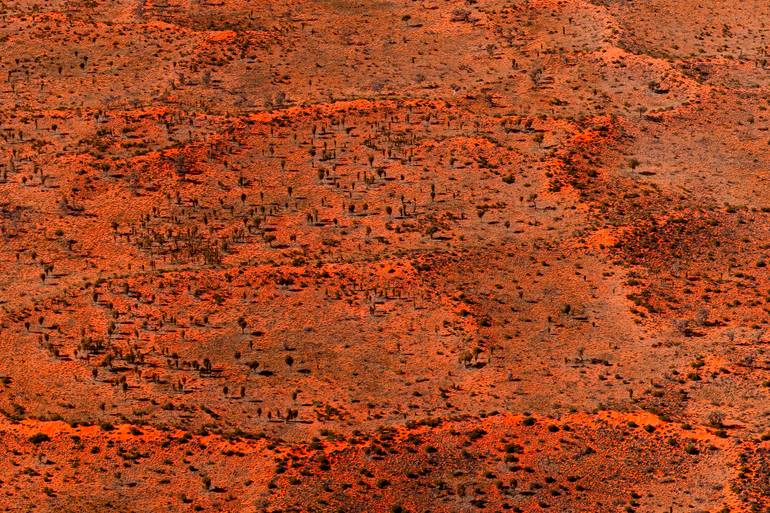 'Heartland' is an abstracted landscape of the outback. This artwork features a vast landscape dotted with trees and exposes the beauty of this rugged Australian land from an aerial perspective with a rich red palette.