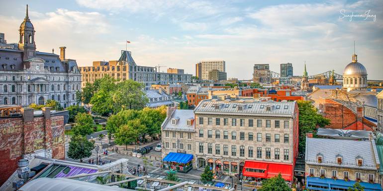 (Montreal, Quebec, Canada) Old Montreal basks in the golden hour, its historic buildings and cobbled streets telling tales of the past amidst a bustling modern life. This view captures the essence of the city's rich history and vibrant culture.