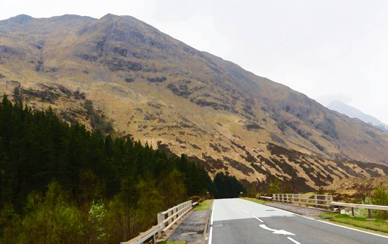 A highway passing through the Scottish Highlands, a scenic location. There is very little habitation over here, just nature at its best. The road runs at the base of a hill, with the hill located at the left side of the road and with a number of trees growing high. Right in front, the road passes ov...