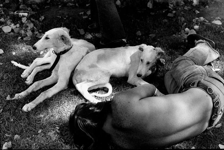 I was shooting street photography at a park in Cotati, Ca. in the year 1977. I was attracted by the light on the dogs and the sleeping hippie. The limited edition print are on Canson Infinity paper. It's signed and numbered in pencil on the front and includes a Certificate of Authenticity.