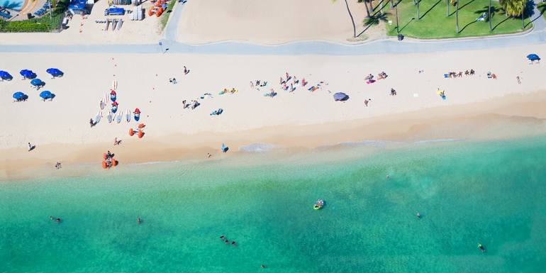 Honolulu is famous for its beaches. Fort Debussy Beach Park is a popular stretch of white-sand beach located in the heart of Waikiki. This image focuses on the surfers waiting for the next wave or just enjoying the clear turquoise waters. This image was captured from a helicopter. My work focuses o...