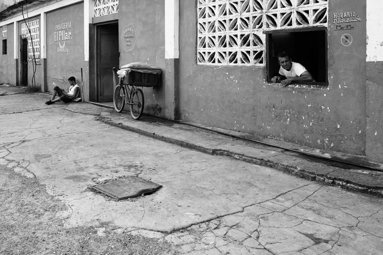 Observation of two Cuban males at a business in central Vinales Cuba, one relaxing and the other one looking out from a small window hatch clearly anxious. I like the contrast between the two characters in this observational documentary image. Captured with a Leica Q camera.
