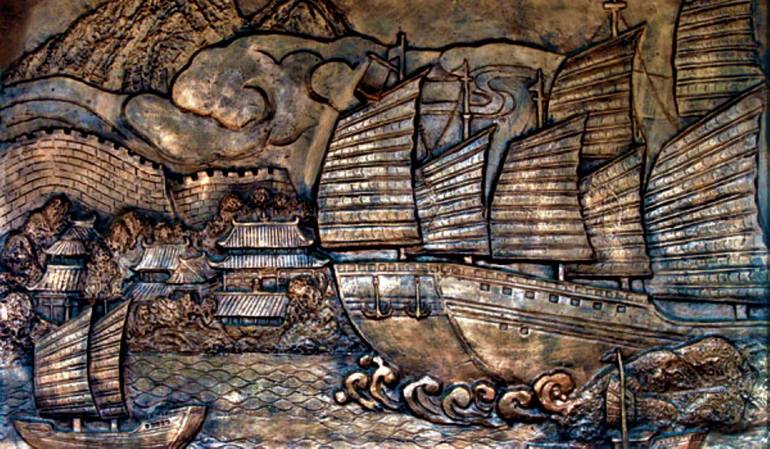 The mural-sized limited edition print (1-50) of IMPERIAL ARMADA BRONZE RELIEF [60" x 110"], replicates a famous bronze relief depicting an ancient Imperial Chinese Armada moving past the Emperor's viewing stand and out to sea. The scale of this architectural art print replicates the bronze wall reli...