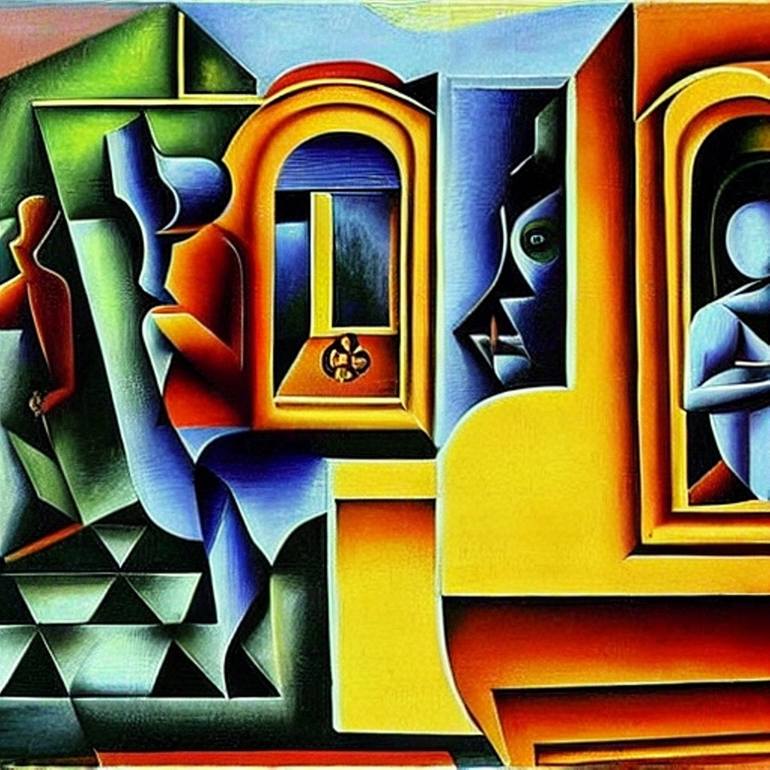 AI created print representing a surreal interpretation of the images throughout the journey across India taken while riding an old type crowded passenger train.