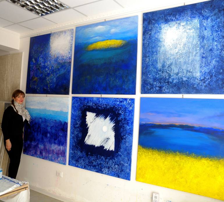 A self portrait with my 6 blue artworks, just finished. Every painting is 100x100x2 cm. Technique: acrylic on canvas