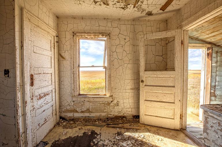 Rebecca Skinner’s “Interior III” is a 12 x 18 inch color photograph taken from inside an abandoned farmhouse in North Dakota. The viewer gets a glimpse of the beautiful landscape thru a dilapidated kitchen window surrounded with walls of white peeling paint. A door to the left peeks curiosity, while...