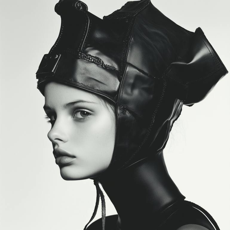 This striking monochrome art piece presents a young woman in profile, her gaze sharp and unwavering, embodying an ethereal fusion of strength and elegance. She dons a futuristic, sculptural headpiece made of sleek, glossy black leather that contrasts against her soft, delicate features. The piece pl...