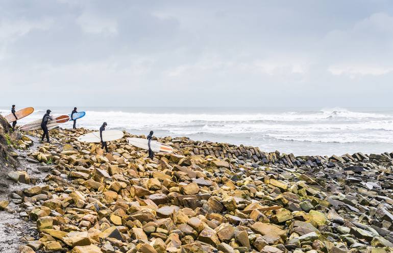 A group of longboard surfer's make there way over the rocks towards the sea at Kimmeridge Bay in Dorset, UK. This image looks stunning as a large print on the wall at home or in the office. Limited Edition of 20. ' C-TYPE ' prints offer the most outstanding professional, silver based, archival pr...