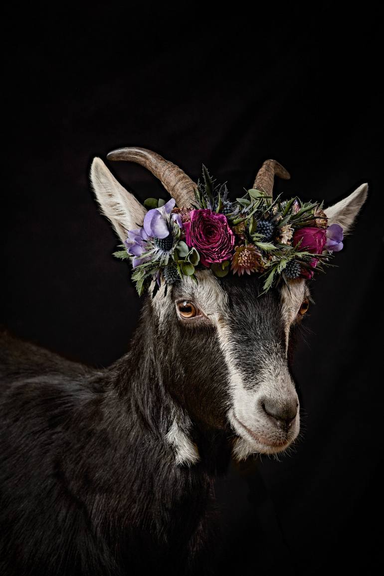 In a stable surrounded by darkness, a breathtaking sight unfolds. Flower-crowned farm animals are captured in a style reminiscent of the great master Rembrandt. Cows, sheep, and goats pose against the black backdrop, their forms illuminated by a soft light. The delicate petals of s daisies, roses, ...