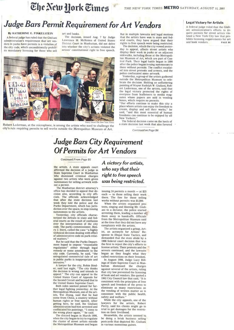 Robert Lederman is the President of A.R.T.I.S.T.(Artists Response To Illegal State Tactics) a group dedicatedto First Amendment advocacy for street artists. Lederman has won four Federallawsuits about artists free speech rights and the right to protest. He is a painter, printmaker, musician and filmmaker. Lederman is perhaps best known as the artist who painted hundreds of satirical portraits of NYC Mayor Rudolph Giuliani. Giuliani had Lederman falsely arrested, but never once convicted, more than 40 times between 1994 and 2000. The Giuliani portraits appeared thousands of times in the media during the Giuliani era and were a constant subject of controversy during those years. Lederman is featured in the just released documentary Its Giulianitime. His successful lawsuits made it legal to sell art on the street without a license, in NYC Parks without a permit and to protest without a permit on the steps of the U.S. Capitol. For more information visit his website: