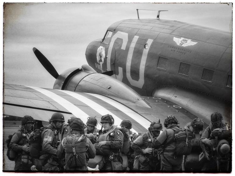 A stick of re-enactors prepares to board D-Day Doll, their transport for a demo jump at IWM Duxford.