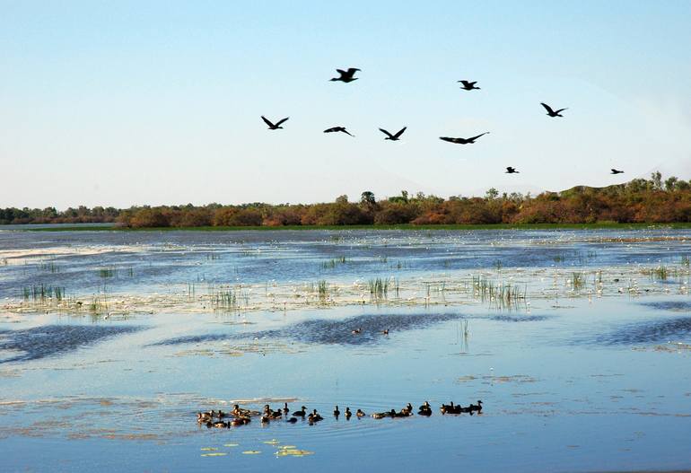 Ducks are swimming in one of the reservoirs and birds are flying in the sky at Kakadu National Park, N.T. Australia. It is a wonderful and most enjoyable experience to sit at a bench and watch the scene. This image offers inspiration, peace and calmness.