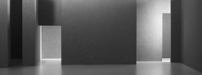 In the most recent series of works, I went looking for depth / perspective in the broadest sense of the word by photographing architectural studio setups. In these arrangements, I use lighting to get the desired effect. These mini sets are the basis of the work and the photo and finishing are its re...