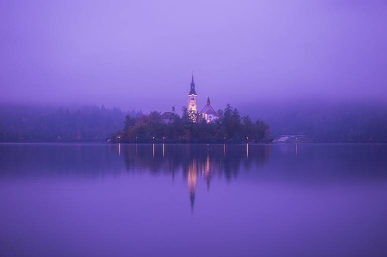 Capture the serene beauty of Lake Bled, Slovenia, with this stunning photograph. The iconic church on the island is a testament to both nature and architecture. This piece transports you to a beloved European destination. This modern photogram print combines color and realism, printed using the C-t...
