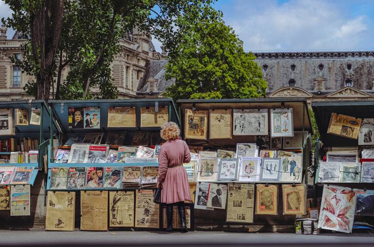 This image captures a classic Parisian bookstall along the Seine, a tradition dating back to the 16th century. The "bouquinistes," as these booksellers are known, have been granted the right to sell books, postcards, and vintage art along the river since the 1850s. These green-painted stalls have be...