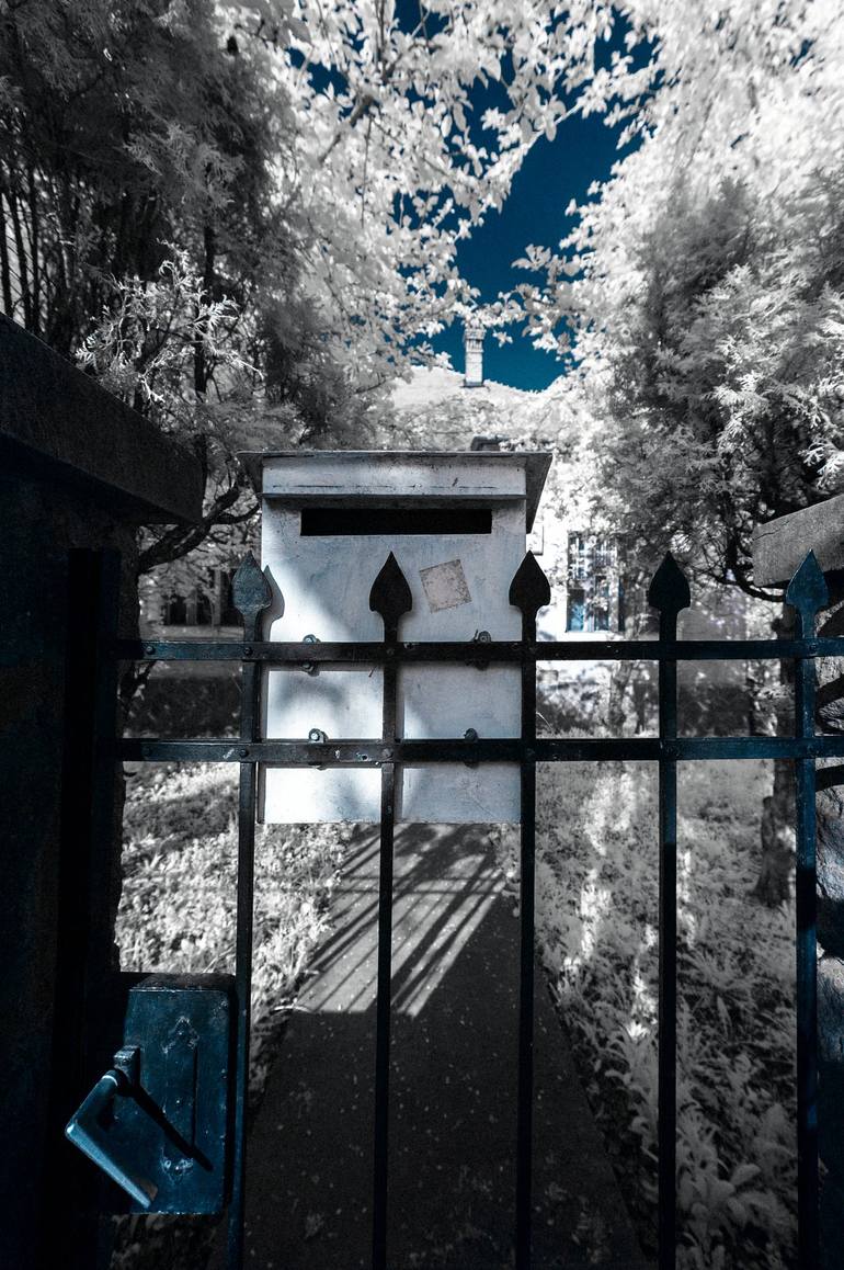 Timeless elegance: an iron gate and mailbox in surreal contrast.An ordinary mailbox through the lens of infrared magic.The mystery beyond the gate—where does it lead? Ultrasmooth Fine Art paper, coated with double adhesive foil with neutral PH For other sizes please enquire (through Saatchi Art supp...