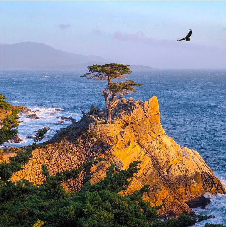 This timely photograph of the Lone Cypress Tree in Pebble Beach Ca with a red tailed hawk circling overhead blends color with light. The artwork is offered as a limited edition Giclee print shipped in a tube, you have the option of canvas wrapped around the edges of a wooden frame at no additonal co...
